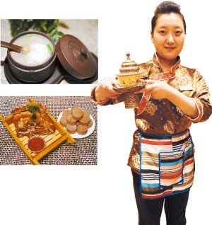 藏式蕨麻猪安多香巴拉饭店的服务员端上美味酥油茶(右)