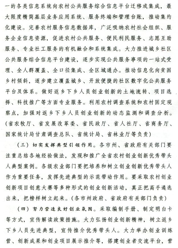 现将甘肃省人民政府办公厅《关于支持返乡下乡人员创业创新促进农村一二三产业融合发展的实施意见》(甘政办发〔2017〕24号)转发给你们,请按照省上部门及行业分工抓好贯彻落实。州农牧局牵头成立州级农村创业创新协调领导小组,定期开展调研及督查,确保相关政策的落地生效,切实解决返乡下乡创业人员工作中的实际问题和困难。